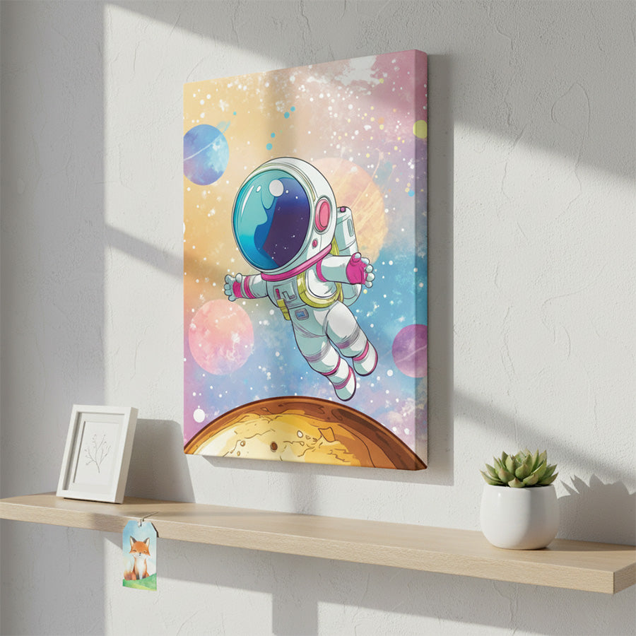 Add a touch of cosmic wonder to any room with this delightful canvas print. Isabelle, our adventurous astronaut floats joyfully through a pastel galaxy filled with twinkling stars and colorful planets. Her pink accents pop against the dreamy rainbow space background, creating the perfect piece for nurseries, children's bedrooms, or any space that needs a spark of imagination.