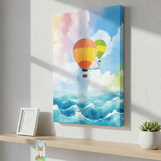 Add a touch of adventure to any room with this dreamy watercolour canvas print. Bright hot air balloons drift peacefully above rolling ocean waves, creating a scene of wonder and possibility. The vibrant orange balloon leads the way across a sky filled with fluffy clouds and gentle colour, while the turquoise waters below dance with white-capped waves.