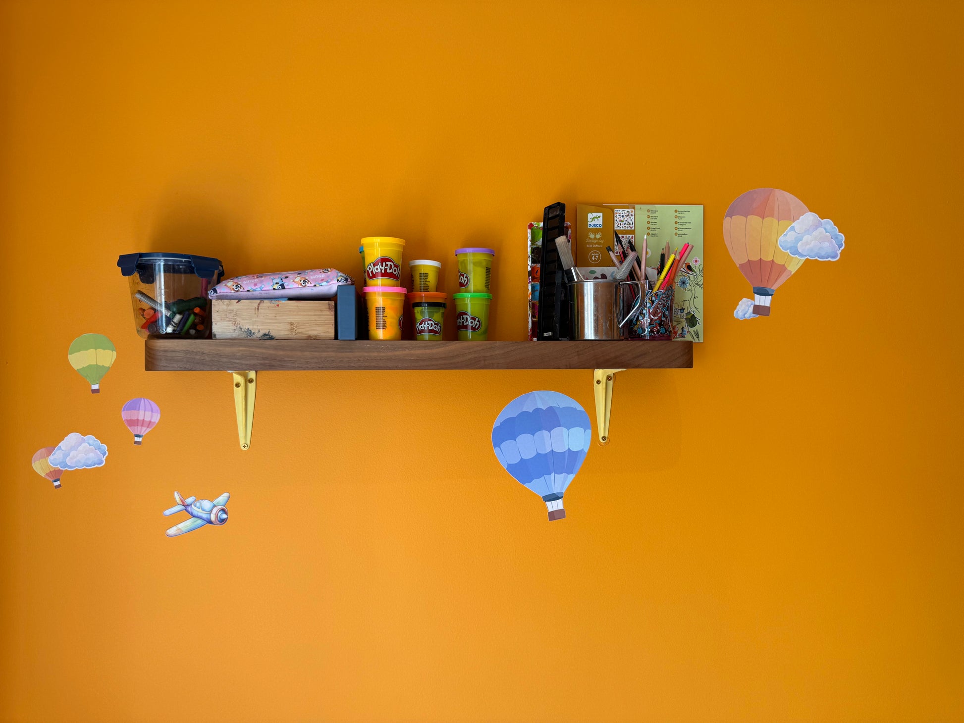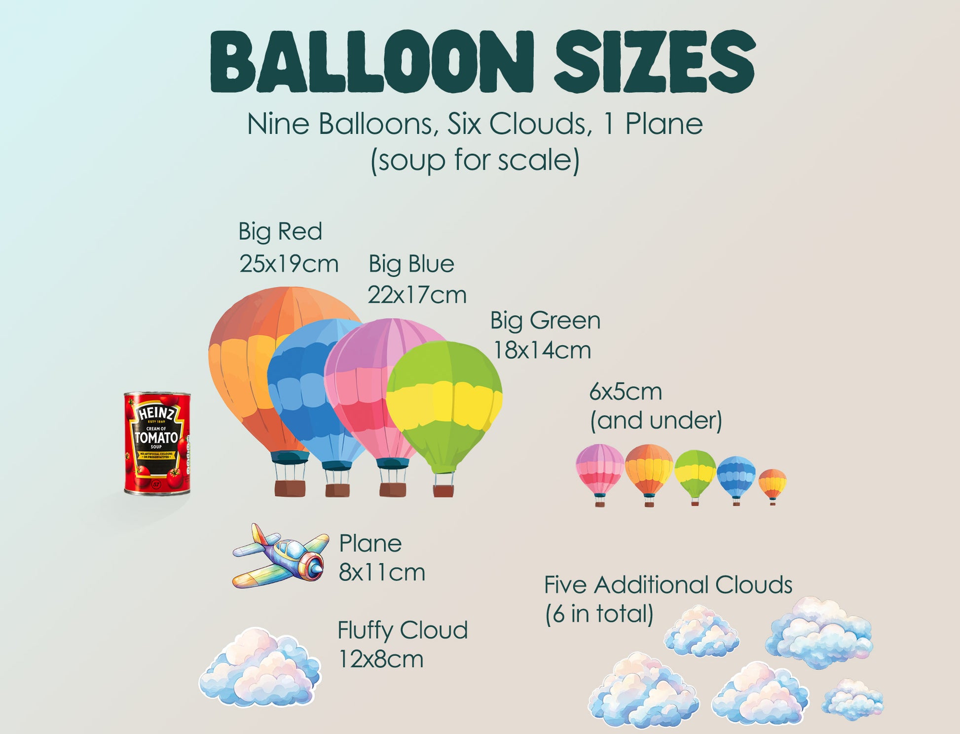Let imaginations soar with this dreamy collection of hot air balloons, fluffy clouds, and one adventurous little airplane. Each piece is lovingly illustrated in soft, cheerful colours - from gentle pinks and warm oranges to sky blues, creating a peaceful yet playful atmosphere perfect for nurseries, playrooms, or any space that needs a touch of wonder.