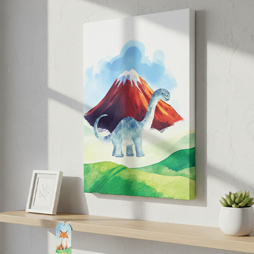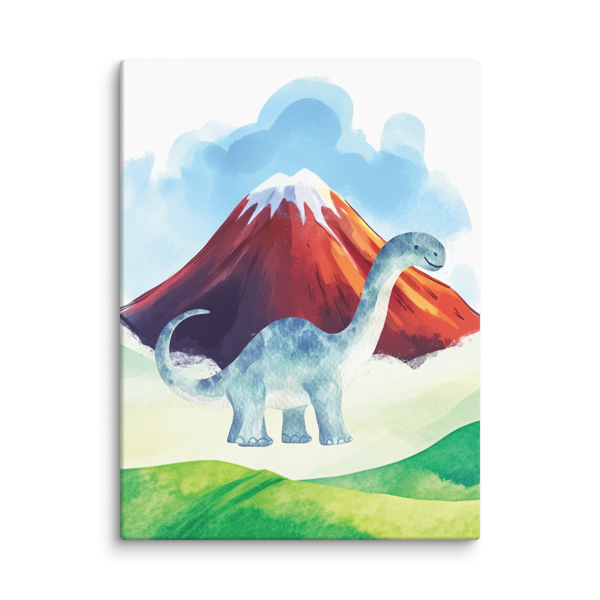 Add a touch of prehistoric charm to any room with this delightful watercolour canvas print. Bertha, our gentle blue Brachiosaurus (yes, that's her name!), roams peacefully against a backdrop of rolling green hills and a majestic red mountain. Perfect for nurseries, children's bedrooms, or any space that needs a splash of imaginative charm.