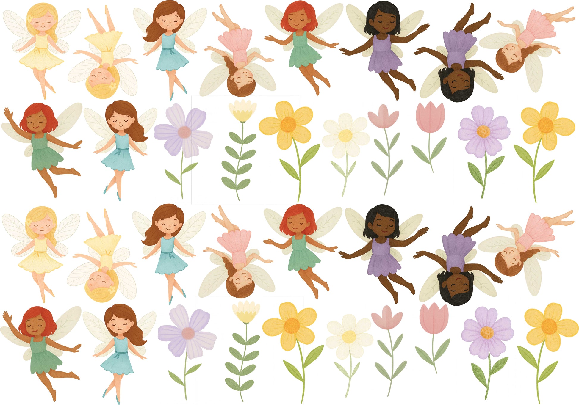 Each set includes a 35 x 50cm sheet with 36 stickers in total – featuring a mix of colourful fairies and blooming flowers. Each fairy measures around 9cm tall, while the flowers are perfectly sized to scatter among them, letting you create your own enchanting scene.