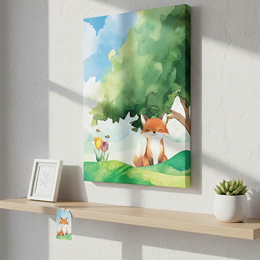 Add a touch of woodland charm to any room with this delightful watercolour canvas print. Little Fox, sits contentedly in a rolling meadow, surrounded by spring tulips and buzzing bees. Her gentle smile and the serene landscape create the perfect piece for nurseries, children's bedrooms, or any space that needs a splash of natural magic.