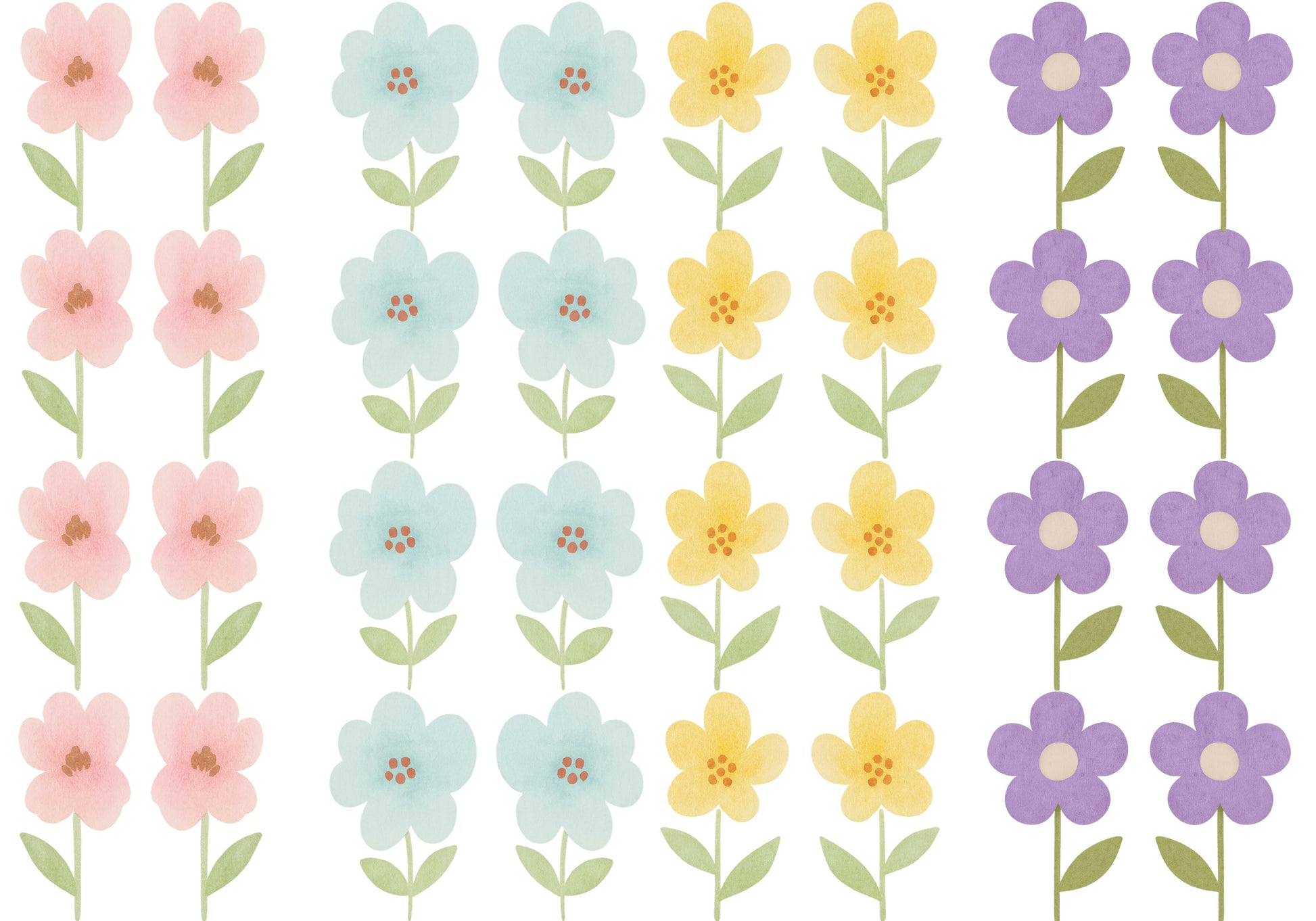 Each set includes a 35 x 50cm sheet with 32 stickers in total – a mix of watercolour flowers in four beautiful colours: pink, marigold, violet and blue. Each flower measures around 8cm tall, making them the perfect size to scatter freely, group in clusters, or arrange in neat repeating patterns for a timeless floral look.